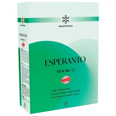 اسپرانتو 36-4-10 یک کود 100٪ محلول در آب با فرمولاسیون اسیدی است که به راحتی جذب می شود. این محصول حاوی طیف وسیعی از عناصر مغذی ماکرو به همراه ریز مغذی ها و با سطح پتاسیم بالا مناسب برای محصولاتی است که تقاضای پتاسیم زیادی دارند و همچنین برای مراحل نهایی رشد محصول که گیاه نیاز به مقادیر بالایی پتاسیم دارد.